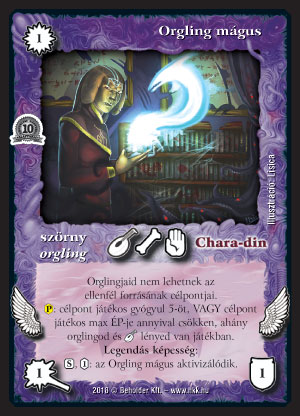 Szöveg: Orglingjaid nem lehetnek az ellenfél forrásának célpontjai. (P): célpont játékos gyógyul 5-öt, VAGY célpont játékos max ÉP-je annyival csökken, ahány orglingod és _legendás lényed van játékban. Legendás képesség: (S), [1]: az Orgling mágus aktivizálódik.