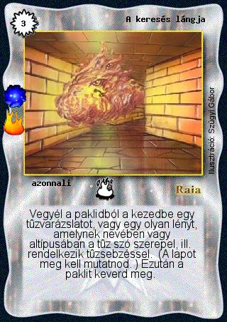 Szöveg: Vegyél a paklidból a kezedbe egy tűzvarázslatot, vagy egy olyan lényt, amelynek nevében vagy altípusában a tűz szó szerepel, ill. rendelkezik tűzsebzéssel. (A lapot meg kell mutatnod. ) Ezután a paklit keverd meg.