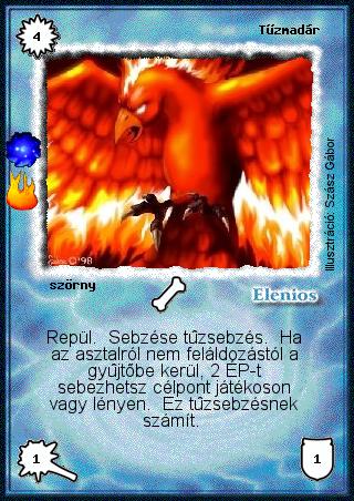 Szöveg: Repül. Sebzése tűzsebzés. Ha az asztalról nem feláldozástól a gyűjtőbe kerül, 2 ÉP-t sebezhetsz célpont játékoson vagy lényen. Ez tűzsebzésnek számít.