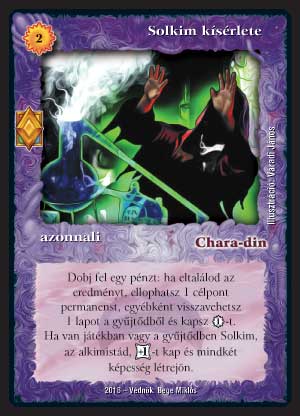 Szöveg: Dobj fel egy pénzt: ha eltalálod az eredményt, ellophatsz 1 célpont permanenst, egyébként visszavehetsz 1 lapot a gyűjtődből és kapsz 1_VP-t. Ha van játékban vagy a gyűjtődben Solkim, az alkimistád, [[1]]-t kap és mindkét képesség létrejön.