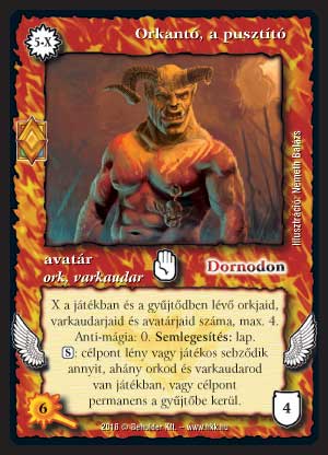 Szöveg: X a játékban és a gyűjtődben lévő orkjaid, varkaudarjaid és avatárjaid száma, max. 4. Anti-mágia: 0. Semlegesítés: lap. (S): célpont lény vagy játékos sebződik annyit, ahány orkod és varkaudarod van játékban, vagy célpont permanens a gyűjtőbe kerül.
