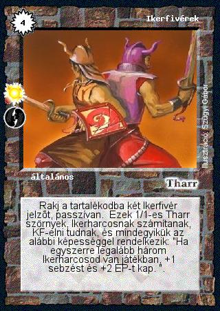 Szöveg: Rakj a tartalékodba két Ikerfivér jelzőt, passzívan. Ezek 1/1-es Tharr szörnyek, Ikerharcosnak számítanak, KF-elni tudnak, és mindegyikük az alábbi képességgel rendelkezik: "Ha egyszerre legalább három Ikerharcosod van játékban, +1 sebzést és +2 ÉP-t kap. ".