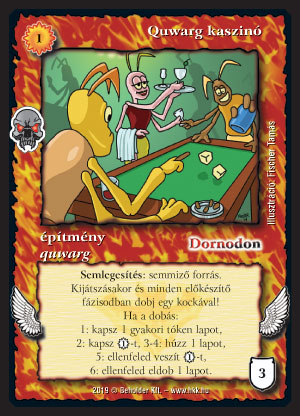 Szöveg: Semlegesítés: semmiző forrás. Kijátszásakor és minden előkészítő fázisodban dobj egy kockával! Ha a dobás: 1: kapsz 1 gyakori tóken lapot, 2: kapsz 1_VP-t, 3-4: húzz 1 lapot, 5: ellenfeled veszít 1_VP-t, 6: ellenfeled eldob 1 lapot.
