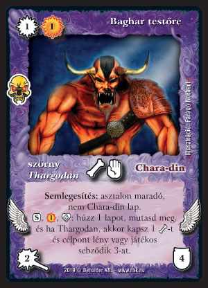 Szöveg: Semlegesítés: asztalon maradó, nem Chara-din lap. (S), (1), _etnikum: húzz 1 lapot, mutasd meg, és ha Thargodan, akkor kapsz 1 _*-t és célpont lény vagy játékos sebződik 3-at.
