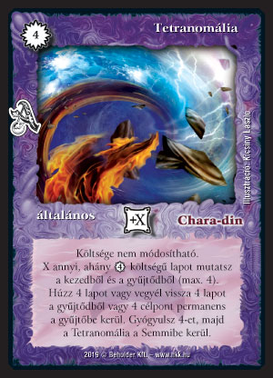 Szöveg: Költsége nem módosítható. X annyi, ahány 4_VP költségű lapot mutatsz a kezedből és a gyűjtődből (max. 4). Húzz 4 lapot vagy vegyél vissza 4 lapot a gyűjtődből vagy 4 célpont permanens a gyűjtőbe kerül. Gyógyulsz 4-et, majd a Tetranomália a Semmibe kerül.