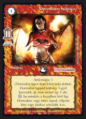 Szöveg: Anti-mágia: 1 (Dornodon lapot nem lehet neki dobni). Dornodon lapjaid költsége 1-gyel kevesebb, de nem mehet így 1 alá. (S): ha minden, a kezedben lévő lap Dornodon, vagy nincs lapod, célpont lény vagy játékos sebződik 4-et.