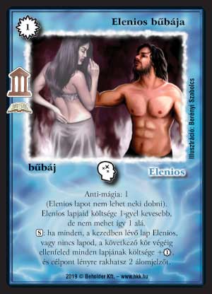 Szöveg: Anti-mágia: 1 (Elenios lapot nem lehet neki dobni). Elenios lapjaid költsége 1-gyel kevesebb, de nem mehet így 1 alá. (S): ha minden, a kezedben lévő lap Elenios, vagy nincs lapod, a következő kör végéig ellenfeled minden lapjának költsége +1_VP, és célpont lényre rakhatsz 2 álomjelzőt.
