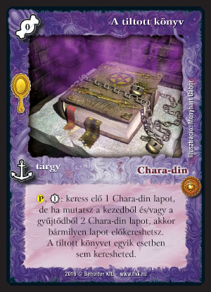 Szöveg: (P), 1_VP: keress elő 1 Chara-din lapot, de ha mutatsz a kezedből és/vagy a gyűjtődből 2 Chara-din lapot, akkor bármilyen lapot előkereshetsz. A tiltott könyvet egyik esetben sem keresheted.