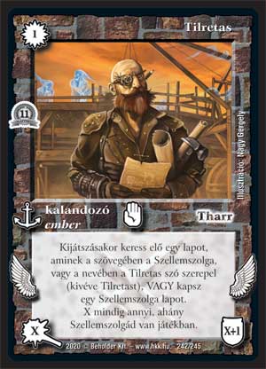 Szöveg: Kijátszásakor keress elő egy lapot, aminek a szövegében a Szellemszolga, vagy a nevében a Tilretas szó szerepel (kivéve Tilretast), VAGY kapsz egy Szellemszolga lapot. X mindig annyi, ahány Szellemszolgád van játékban.
