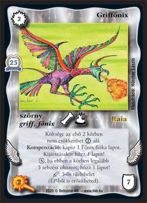 Szöveg: Költsége az első 2 körben nem csökkenhet 2_VP alá. Kompenzáció: kapsz 1 Főnix fióka lapot. Kijátszásakor húzz 1 lapot! (S), ha ebben a körben legalább 5 sebzést okozott, húzz 1 lapot! _+: 5-ös tűzlehelet (ÉP-ből is erősítheted).