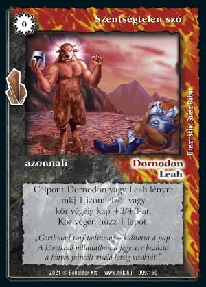 Szöveg: Célpont Dornodon vagy Leah lényre rakj 1 izomjelzőt vagy kör végéig kap +3/+3-at. Kör végén húzz 1 lapot!