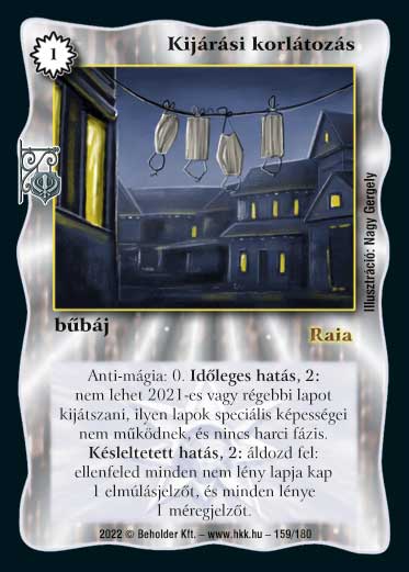 Szöveg: Anti-mágia: 0. Időleges hatás, 2: nem lehet 2021-es vagy régebbi lapot kijátszani, ilyen lapok speciális képességei nem működnek, és nincs harci fázis. Késleltetett hatás, 2: áldozd fel: ellenfeled minden nem lény lapja kap 1 elmúlásjelzőt, és minden lénye 1 méregjelzőt.