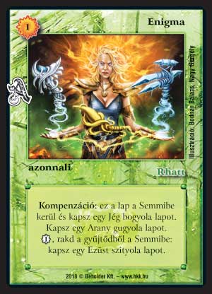 Enigma (9): Igaz, hogy kis apró dolgokat tud eleinte, de hosszútávon azért igencsak idegesítőek lesznek a mindenféle Rhatt tárgyak az asztalon. Ha csak azt nézzük, hogy kijátszva ad egy Arany gugyolát, majd átforgatva egy Ezüst szityolát, akkor innentől kezdve egy kis mana befektetéssel nagy körönként tudunk 2 lapot húzni. Ha pedig lecounterelik, akkor szépen le tudjuk lődözgetni az ellenfél lényeit, vagy lassan elégetjük a pakliját. Az egyetlen optimális megoldás erre a lapra, ha a kézből a Semmibe dobatjuk, de ilyen lap nem sok van.