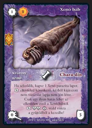 Xenó báb (9): A kiegészítő talán egyik legerősebb lapja. Asztalról automatikus counter, így nyilván megvan az a hátránya, hogy az ellenfél dönti el, hogy mit rak bele. De ha börtönben vagyunk, vagy épp Korlátozással játszunk, akkor nem sok választása lesz. Counterlés mellé még szépen termelgeti a kis parazitákat, hogy ha esetleg sikerül levakarni a bábot, akkor pikk-pakk vissza is térhessen a csatatérre. Elmeroncsolóval karöltve azért elég szép lockot tud rakni az ellenfélre. Úgy érzem, Chara-din se mostanában lesz hanyagolva.
