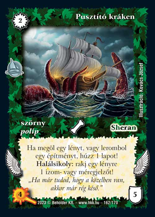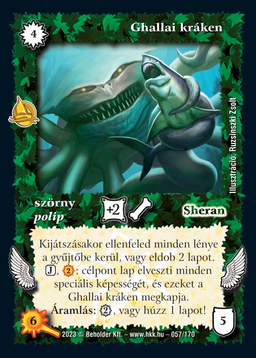 Pusztító kráken (6): Hasonló dilemmában vagyok ezzel a lappal, mint a Krákenölővel (ami önmagában elég bizarr helyzet :). Azonban mivel a Sheranban több lényes paklit látok és ennek a képességei konkrét lapelőnyt tudnak adni, ezért annál valamivel jobbnak tartom.