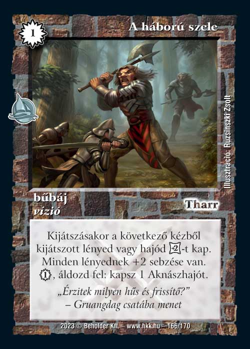 A háború szele (7): Lényes és hajós paklikat segítő vízió lap. Egyébként leginkább hordák közé tudom elképzelni, ott tudjuk mindhárom képességét jól kihasználni (Aknászhajó is sebez körönként kettőket). Abban korrekt lesz, de az nem meggyőződésem, hogy eljut arra a szintre, mint sok másik vízió, hogy 1-1 darab kontroll paklikba is belefér.