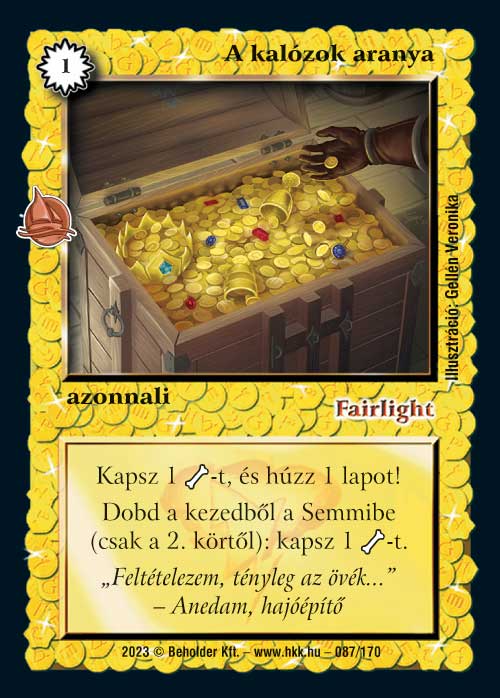 A kalózok aranya (3): Egy varázspontunkat vagy egy lapunkat csonttá alakítja ez a lap. Ezzel még nem is lenne gond, csak éppen ez nyilvánvalóan tárgyak közé jó elsősorban, amiknek az epikus követőjük pontosan ugyanezt tudja, így ennek tükrében eléggé feleslegesnek érzem ezt a lapot (a Csatamezők önmagában nem indokolják egy ennyire gyenge lap használatát). Bontott környezetben viszont cantrip mivolta miatt elfér.