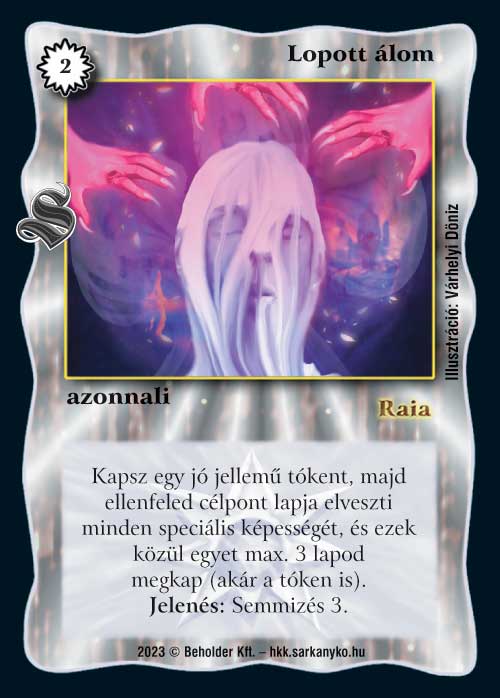 Lopott álom (9): Nagyon érdekes és szerintem nagyon erős lap is. 2-ért egy lapnak a képességeit elvenni és termelni egy tókent még nem olyan nagy szám, de nem is elvetendő képesség. Ami viszont igazán izgalmas, hogy ezt az elvett képességet akár 3 másik lapunknak is odaadhatjuk. Amikor egyik tesztmeccsen az ellenfelemnek hirtelen lett 3 Rundhalja, az gyakorlatilag meccset döntött el, de mondjuk 3 Ramonával sem szívesen néztem farkasszemet. Úgyhogy ha használunk lényeket szerintem bőven megéri próbálkozni vele, mert a kicsit drágább költsége ellenére is óriási előnyt képes adni.