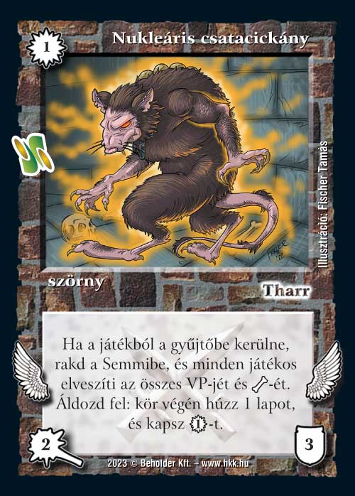 Nukleáris csatacickány (8): Az előző két laphoz képest ez már kissé speciálisabb, de azért meglehet a maga helye. Különösen Hegymélyi keltető mellett látom értelmét, ott az ellenfelet valószínűleg sokkal jobb fogja zavarni az elvesztett varázspont, mint minket. De figyeljünk arra a számos apró trükkre, ami a lapban van, egyrészt, hogy áldozásnál is kisül, másrészt, hogy a saját tápunkat a kör végén kapjuk (bár a lap szövege ilyen téren nem teljesen egyértelmű, de ezt nyugodtan vehetjük biztosra). Ezekkel együtt már korrekt lap lehet belőle.