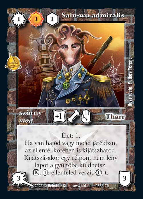 Sain-Wu admirális (7): A tesztelés elején brutálisan erős volt: 2 zsz-ért jött. Ám ez sokszor akkora tempót jelentett, hogy végül is picit drágult a költsége. Így picit esetlegesebbnek tűnik, de azért szerintem bőven fog kellemetlenségeket okozni. Van a játéknak olyan szakasza, ahol a körönkénti 1 vp buktatás meccset jelent, ő maga pedig életjelzővel nagyon nehezen levakarható lap. Elsősorban nem is hajók és moák, hanem Hegymélyi keltető mellé érzem erősnek.