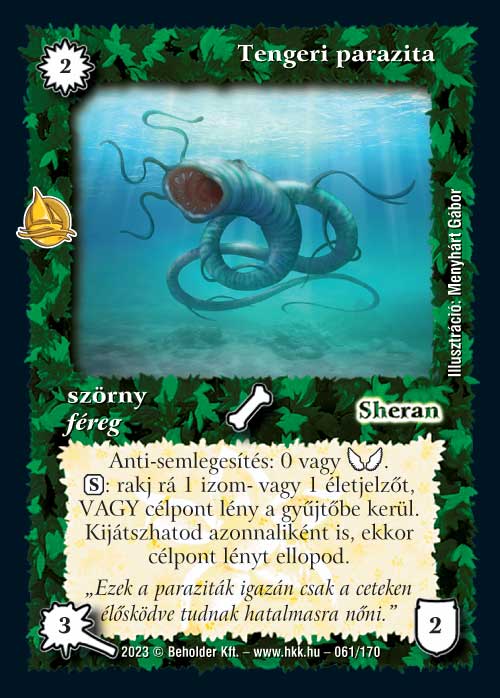 Tengeri parazita (7): Újabb kicsit a helyét kereső lap. Paraméterei alapján jó lehet, mert erős, mindkét képessége hatékony, van védelme, de valahogy mégsem igazán látom, hova kellene tenni, mert Sheran hordás vonalba kicsit drága, Zarknodék mellé a színe nem az igazi és az izmokat sem lehet annyira kihasználni. Ezzel együtt drukkolok neki, mert lehetőség bőven van a lapban.