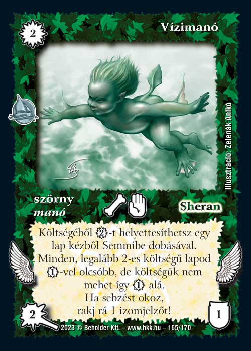 Vízimanó (7): Ha már a sok 2 vp-s lénynél kérdeztem, hogy hova, akkor itt van valaki, aki összefoghatja őket. Nemcsak, hogy ő maga nagyon olcsón jöhet, de rögtön utána érkezhet még egy társa és ha eljut az őrposztig, már komoly előnyt adhat. Ezzel együtt nem rizikómentes a vállalkozás, hiszen magának a manónak sajnos semmilyen védelme nincs ráadásul a saját paklijában a színe is határeset (de azért nem rossz). Meglátjuk, mit tud adni neki a sors.