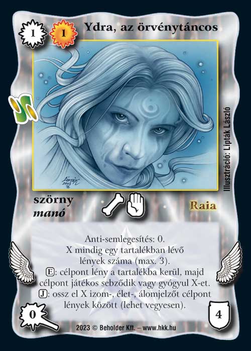 Ydra, az örvénytáncos (8): Na, mégiscsak itt a manó seregem egyik tagja, amit használtam a tesztversenyes Villámháborúban. Oda nagyon kemény volt, mert sokszor az ellenfél körében kijátszva komoly meglepetést okoztam vele az egyre fontosabbá váló harci fázisban (akár lények leküldésével, akár izmok osztásával). Igazából szinte bármilyen lényes pakliban el tudom képzelni, mert ha megvédjük, akkor a 3 izom már önmagában elég érv mellé (ha nem veszi le őket rögtön egy megszakítás :) ). az meg hogy még e mellé hozzá tud tenni az öléshez, már csak hab a tortán. Nekem személy szerint ez a kedvenc lapom a kódosok közül.