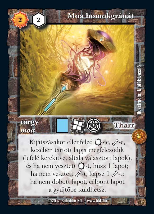 Végezetül pedig nézzük a beígért isteni kártyát! Rengeteg ikon (köztük egy új ikon, ideiglenesen kék négyzettel jelölve, melyről valószínű majd ősszel olvashattok), összetett és kifejezetten érdekes képesség, de mégis kellő univerzalitás. Ezt kínálja a Moa homokgránát. Jövőhéten folytatás!