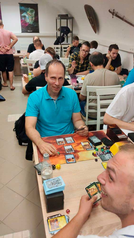 Kicsit olyan érzés volt az egész, mint a Gladiátorban van az a jelenet, ahol a vadonatúj kiképzett gladiátorok beszaladnak életükben először a arénába, ahol rögtön a bejáratnál egy fickó egy hatalmas láncos buzogányt forgat, és az első embert az telibe kapja. De azért jól szórakoztam, és érdekes volt látni közvetlen közelről, hogy is működik ez a homok és Teknős bölcsesség szinergia ebben a pakliban. Na meg stílszerűen, ha már Vácon voltunk, hogy ver tönkre az első körben lerakott Vcz' a remete :)