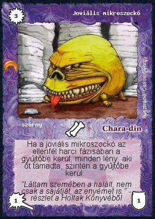 Szöveg: Ha a joviális mikroszockó az ellenfél harci fázisában a gyűjtőbe kerül, minden lény, aki őt támadta, szintén a gyűjtőbe kerül.