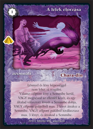 A lélek elorzása (8): Rengeteg hasznos képesség egy 1 VP-s azonnalin. Ha a Mindenható plazmagömbökkel hasonlítjuk össze, akkor látható, hogy ez a lap sokkal jobb, az általunk választható dobatás, valamint a pakliból kivétel pedig viszonylag ritka képességnek számítanak. A színe miatt Chara-din követője és Edralian mellé illeszkedik a legjobban - kissé hasonlít egyébként a nemrég megjelent Régmúlthoz, ám nehéz counterelhetősége miatt simán jobb annál.