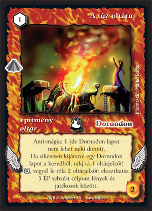 A tűz oltára (8): A piros szín is megkapta a maga jól megérdemelt oltárját. Sheran oltára példájából okulva kapott egy körönkénti egyes korlátot, csak hogy egy kör alatt mégse lőjük már ki az ellenfelet, ingyen, anti-mágiásan, nehezen leüthetően azonban ez így is egy remek lap, amely kötelező mind tűz deckbe, mind orkok közé.