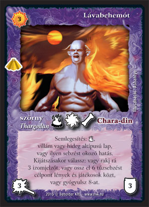 Lávabehemót (6): Eléggé speciális semlegesítés, felemás képességekkel. Követővédésre vannak ennél jobb és olcsóbb lapok, a 3 izomjelző annyira nem csábító egy passzív lényen, így inkább a 6 sebzés szétosztása az asztalon az, ami valamennyire értelmes lehet. Esetleg valamilyen Chara-din zanszilánk pakliban tudom elképzelni, de még oda is kissé drágának tűnik.