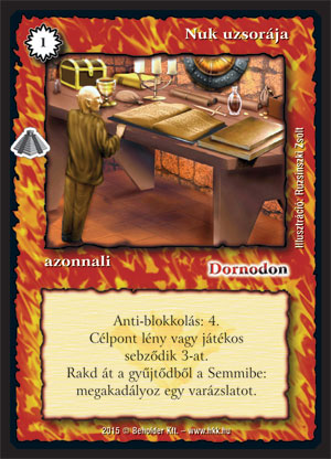 Nuk uzsorája (6): A counter képessége igencsak erős - nagy kár, hogy a másikkal már nem sokra megyünk. Ha ki tudunk lőni vele egy lényt, az persze nem rossz, csak hát leszedés céljából már rég nem ilyen lapokkal játszunk. Gyűjtőgenerálással esetleg még érdekes lehet, illetve a kísérletező kedvüek betehetik Dornodon követője mellé.