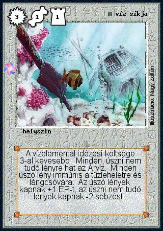 Szöveg: A vízelementál idézési költsége 3-al kevesebb. Minden, úszni nem tudó lényre hat az Árvíz. Minden úszó lény immúnis a tűzleheletre és lángcsóvára. Az úszó lények kapnak +1 ÉP-t, az úszni nem tudó lények kapnak -2 sebzést.