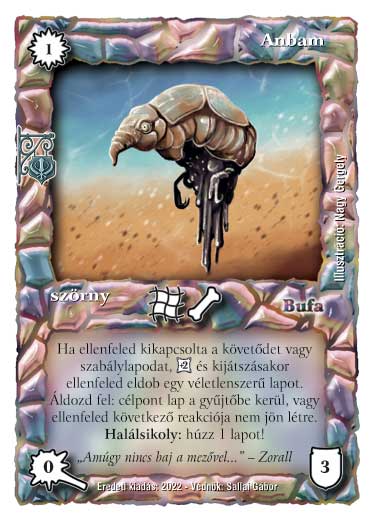 Kiadás: Roxat céhei, Védnök 2023 Gyakoriság: nem gyakori Lapszín (isten): Bufa Típus: szörny Szöveg: Ha ellenfeled kikapcsolta a követődet vagy szabálylapodat, [[+2]] és kijátszásakor ellenfeled eldob egy véletlenszerű lapot. Áldozd fel: célpont lap a gyűjtőbe kerül, vagy ellenfeled következő reakciója nem jön létre. Halálsikoly: húzz 1 lapot! Szinesítő szöveg: "Amúgy nincs baj a mezővel..." - Zorall Illusztráció: Nagy Gergely
