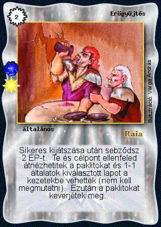 Szöveg: Sikeres kijátszása után sebződsz 2 ÉP-t. Te és célpont ellenfeled átnézhetitek a paklitokat és 1-1 általatok kiválasztott lapot a kezetekbe vehettek (nem kell megmutatni). Ezután a paklitokat keverjétek meg.
