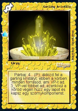Szöveg: Párbaj: 4. (P), áldozd fel a garling kristályt: ebben a körben minden forrásod, ami VP-t ad, 3 VP-vel többet ad; ezenkívül a köröd végén húzz egy lapot és kapsz egy szörnykomponenst.