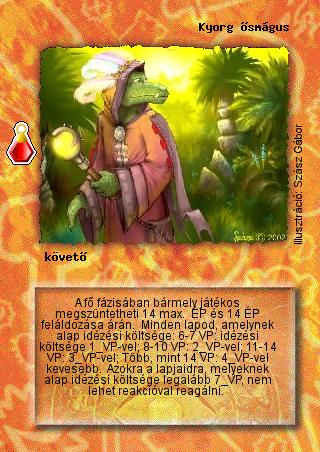 Kiadás: Esthar Császárság, Védnök 2023 Gyakoriság: ritka Lapszín (isten): Nincs Típus: követő Szöveg: A fő fázisában bármely játékos megszüntetheti 14 max. ÉP és 14 ÉP feláldozása árán. Minden lapod, amelynek alap idézési költsége: 6-7 VP: idézési költsége 1 VP-vel; 8-10 VP: 2 VP-vel; 11-14 VP: 3 VP-vel; Több, mint 14 VP: 4 VP-vel kevesebb. Azokra a lapjaidra, melyeknek alap idézési költsége legalább 7 VP, nem lehet reakcióval reagálni. Illusztráció: Szász Gábor