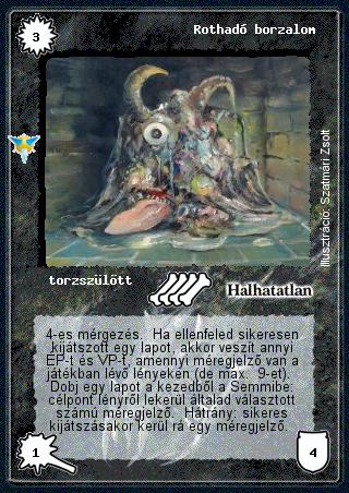 | (AK118) A Gyilkos méreg miatt az ellenfelemen van nyolc méregjelző. Van egy Rothadó borzalmam is, amin egy méregjelző van. Egyet sebződik az ellenfelem, ha kijátszik egy lapot. A játékost mérgezés szempontjából úgy kell tekinteni, mintha lény lenne, de attól még a játékos játékos marad. A borzalmon pedig az áll, hogy az ellenfél annyit sebződik és annyi varázspontot veszít amennyi méregjelző összesen van a lényeken.