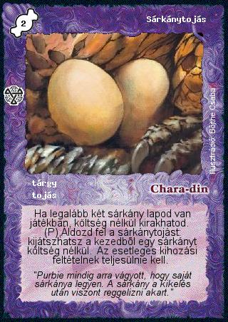 Szöveg: Ha legalább két sárkány lapod van játékban, költség nélkül kirakhatod. (P),Áldozd fel a sárkánytojást: kijátszhatsz a kezedből egy sárkányt költség nélkül. Az esetleges kihozási feltételnek teljesülnie kell.