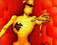 [47,3] Bozóttal teli terepre értél. Rövid megszakítás a sík vidék egyhangúságában. Valamiért úgy érzed, mint ha valami lesne rád. Egy korhadt fatönk belseje jó búvóhelynek tűnik. No, igen a profizmus. Teljesen észrevehetetlen voltál. Nos, lássuk mi volt az ellenfél. Azonnal tudod, hogy egy tetemember volt a rémület okozója. (ld. enc.) Amikor elhal a zaj, előmászol.