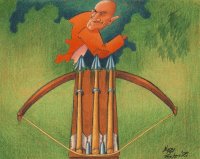 NYÍLCSAPDA (243. TÁRGY)Ezzel az igen bonyolult csapdával hatékonyan védekezhetsz a tolvajok ellen. Az alapelve az, hogy felállítasz a motyódtól nem messze egy felajzott rövid íjat úgy, hogy egy fához vagy bokorhoz rögzíted. Az íjhúrt egy apró fapöcök, bemélyedés, ág vagy hasonló tartja. Egy drótszőr egyik végét az íjhúr közepére kötöd, és ezután, néhány áttétellel kifeszítve elvezeted bokamagasságban a föld fölött. Ezután ha valaki a drótszőrt meghúzza, az íjhúr lecsusszan a pöcökről, és kilövi a nyilat, pontosan abban a vonalban, ahol a drótszőr ki van feszítve - és így nagy eséllyel eltalálja azt, aki a drótszőrhöz ért. Sajnos ez a csapdatípus csak egy irányból véd, ezért ahhoz, hogy igazán hatékony legyen, legalább két rövid íjat kell felállítanod. Ezzel el is érkeztünk a komponensek listájához: 4 drótszőr, két rövid íj, két kötél (az íjak rögzítéséhez) és két nyílvessző. A nyílcsapdát a KT 243 paranccsal készíted el, 10 pontért. Az íjakat ezután már nem tudod rendes íjként használni, mivel gyakran el kell őket törni, a könnyebb rögzítés érdekében. A nyílcsapda a H 243 paranccsal állítható fel, 5 TVP-ért. Nagyon nehéz észrevenni, és d8+2 életpontot sebez. |