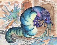 EPOKITFÉREG (147. SZÖRNY)Az epokitférgek a bozótos területek hihetetlenül visszataszító csúszómászói. Áldozatukra először ragadós bélnedved köpnek, amely szemet, szájat, orrot, néha célt tévesztve értékes tárgyakat ragaszthat össze. Szelvényes felépítése miatt igen sok csapás szükséges a leöléséhez, lehetőleg vágófegyverrel. |