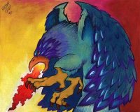 GRIFFŐNIKSZ (106. SZÖRNY)Ez a sas méretű grifflény magas sziklák között épít fészket. Vállalkozó kedvű kalandozók gyakran másznak meg meredek falakat azért, hogy megszerezhessék mágikus erejű tojását. Azonban a griffőniksz minden elégető lehelete még a legtapasztaltabbakat is könnyedén a magasból aláhulló széndarabbá változtathatja. Sokak szerint a tűzköpet a madár által lenyelt és pirkitté átalakított kődarabok eredménye. |
