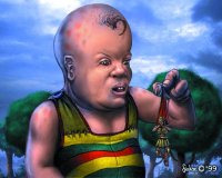 EKHARION BÉBI (768. SZÖRNY)A kicsi ekharionok (persze csak ha kicsinek lehet nevezni egy tíz ember magas groteszk csecsemőt) nagyon szeretnek játszani. Általában megtermett parasztlegényekkel babáznak, mert azoknak jól lehet csavargatni a karját. Alapvetően az emberek szagát nem nagyon szeretik, így gyakran fürdetik őket folyókban, nagyobb tavakban és különböző pocsolyákban. További dolog, ami a kalandozókkal kapcsolatban zavarja őket, hogy sokat rugdalnak, miközben ők az apjuk hőstetteit játsszák el a kedvenc "babáikkal". Általában ezek a hőstettek olyanok szoktak lenni, hogy a papa fejével kettétört egy nagy sziklát, vagy hogy megevett harminc bárányt és három szűz elflányt reggelire. Szüleikhez képest a pszi képességük még elenyésző így nem is használják igazán, csak különböző dolgokra (például, hogy a szemben álló, következő babának mi a gyenge pontja és hol érdemes megmarkolni ahhoz, hogy könnyebben lehessen lóbálni). Ha sikerülne egy ekharion bébit beidomítanod a saját céljaidra, a kirakókockák iránt is érdeklődő "csöppség" minden bizonnyal pillanatok alatt képes lenne felhúzni neked egy-két épületet. |