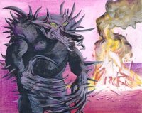 HALÁLOSZTÓ KAIN (168. SZÖRNY)Képzelj el egy közel három méteres, masszív, nyak nélküli fekete tömeget, amelyből hatalmas tüskék állnak ki és két sárgán izzó szem. Igen, a halálosztó kain az a szörny, ami semmi másra nem alkalmas, csak gyilkolásra. Egyetlen kézmozdulatára hatalmas csontpengék csúsznak elő a karja húsából, szájából fél méterre is ki tudja lőni belső állkapcsát, farka iszonyatos méregtüskéket tartalmaz. Emellett pillantásával képes kővé változtatni ellenfelét és ismer néhány trükkös varázslatot is. Érző lény ez? Aligha. Rendelkezik intelligenciával? Ki tudja. Nagyon ritkán bukkan fel, egy-egy ütközetben, átgázolva a lovagok során, kettéroppantva a győzedelmeskedő hadvezér gerincét, vagy egy koronázás során előlép a függöny mögül és a trónban ülő királyfi vérét szétkeni a padlón. Néha főmágusok kincsét őrzi, barikádot építve maga körül a szerencsevadászok és kóbor szörnyek csontjaiból. Ha esetleg néhány pillanatra megpróbálsz vele szembeszállni, nem árt, ha valamilyen ütőfegyverre hagyatkozol. Arra sem árt ügyelned, hogy ez a gonosz lény aránylag ellenálló energiatámadásokkal szemben. Kobuderák könnyen felsérthetik az öklüket a tüskéken! |