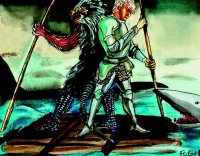 (Továbbmész...) [135,89] Még mindig az erdőben vagy. A távolban egy gigászi csatajelenetet ábrázoló szoborcsoportot látsz. A részleteket is alaposan kiértékelve feltűnik a nagy kavarodás közepén egy apró alak. Ez nem más, mint egy bávatag golombár, amint Chara-din hordáit szecskázza apróra. A torz lények tömege sem bírja legyűrni, mert Ghalla hét valódi istene támogatja. Gyorsan ellátod a sebeidet: +5 életerő.