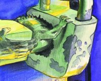 (Továbbmész...) [175,55] A dombság átmegy hegységbe. Találsz egy vaskohót. Találsz egy teljesen lerombolt oltárt. A rombolás csak valami alattomos lény műve lehet. Felfedeztél egy olvasztókemencét. Hopp! Egy örvénylő porfelhőből kialakuló szoborral találkoztál, mely Elena formáját vette fel, amint éppen egy megfelelőnek látszó Chara-din trófeát tűz az övébe! Ezt az alkotást! Te vajon milyen szobrot csinálnál? Különleges érzékeid megállítanak: a közelben fém (ramit kő) kell, hogy legyen!