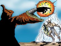 (Továbbmész...) [360,66] Elérkezel az égig érő magashegyek közé. Az előrehaladás itt nagyon nehéz. Úgy érzed, mintha lenne valami mögötted, és hirtelen megpördülsz: de nem, nincs ott semmi. Észreveszel egy viharóriás barlangot. Felfedeztél egy törpe bányát. A távolban egy gigászi csatajelenetet ábrázoló szoborcsoportot látsz. A részleteket is alaposan kiértékelve feltűnik a nagy kavarodás közepén egy apró alak. Ez nem más, mint Kóbor Holló, amint Chara-din hordáit szecskázza apróra. A torz lények tömege sem bírja legyűrni, mert Ghalla hét valódi istene támogatja. Megérzed, hogy a talaj, amelyen taposol, fémet (adamantit) rejt. délnyugatra látsz egy viharfelhőt, benne a következő név rajzolódik ki: De'Cugel.